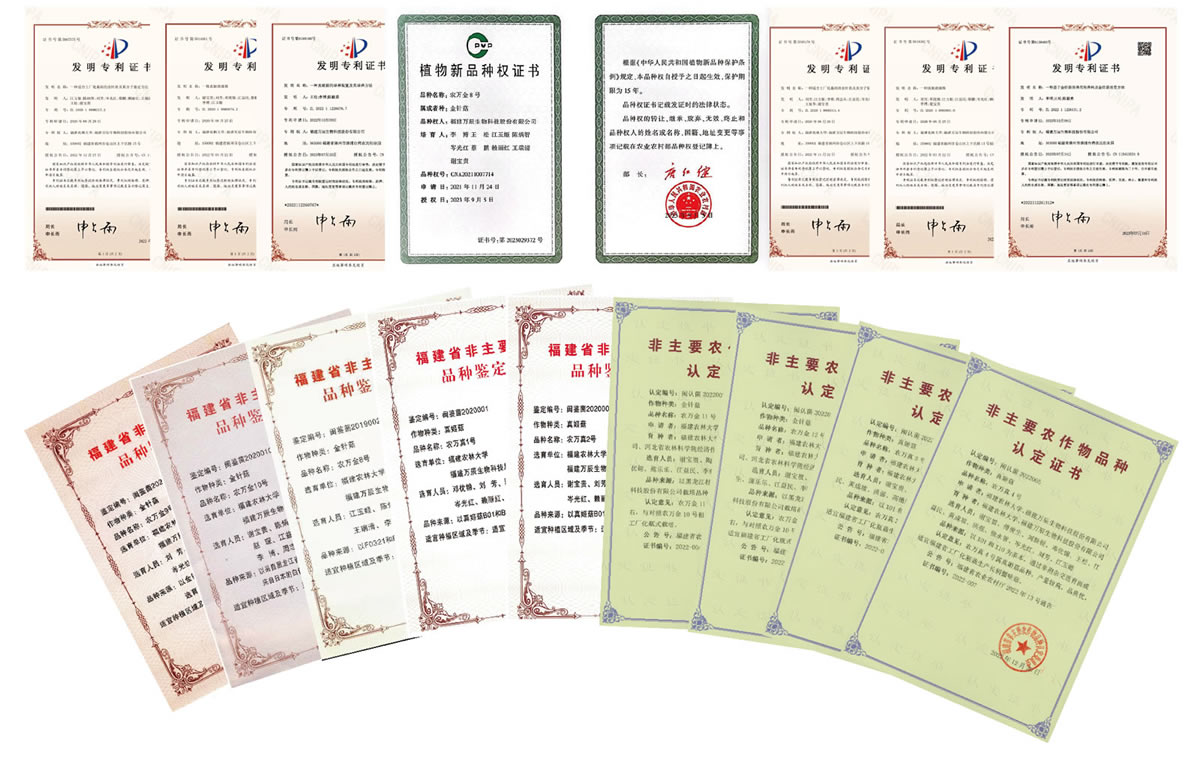 核心技术获国家发明专利7项,自主知识产权食用菌新品种获认定13个,获农业农村部植物新品种权1个。
